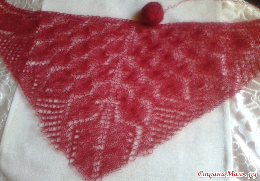 Размер шали после блокировки : по центральной петле- 95 см, по верху- 185 см.