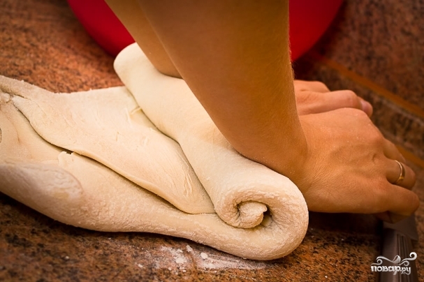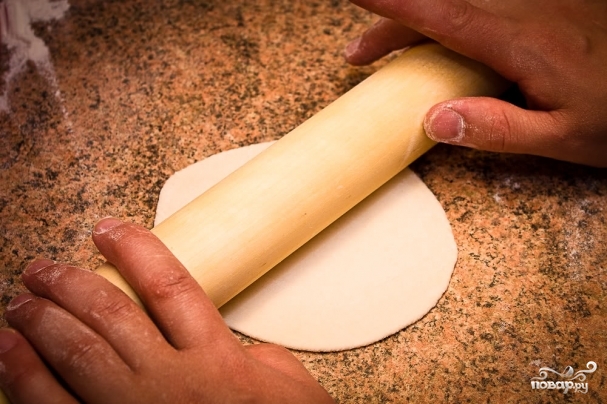 4. Разделите тесто на небольшие кусочки, каждый раскатайте довольно тонко на присыпанной мукой поверхности.
