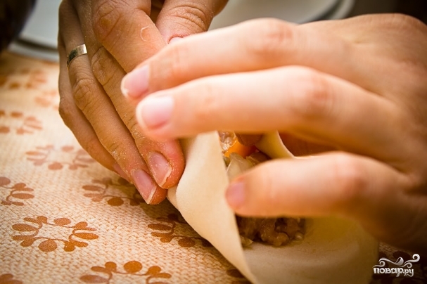 5. Выложите в центр начинку. Не жалейте: ее должно быть довольно много, тогда манты с тыквой и мясом по-узбекски в домашних условиях будут по-настоящему сочными и вкусными.