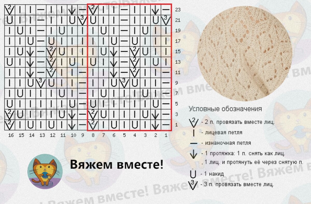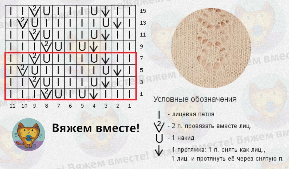 В этом узоре, как и в предыдущем, действуют всё те же правила: для гармоничности узора убавления следует провязывать в верную сторону. Стрелочкой обозначено убавление с наклоном влево, а галочкой с наклоном вправо.