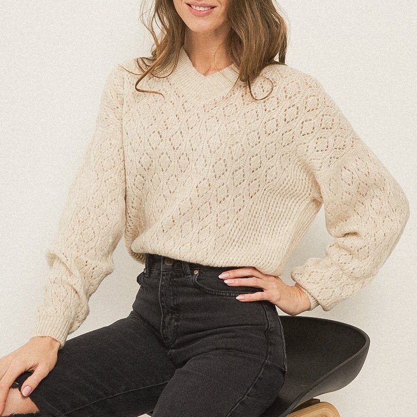 Симпатичный вязаный джемпер от отечественного бренда Вэй в приятном оттенке бежевого украшен ажурными ромбами, как по переду, так и по спинке, при этом боковые участки деталей вяжутся довольно простой вариацией сетки.