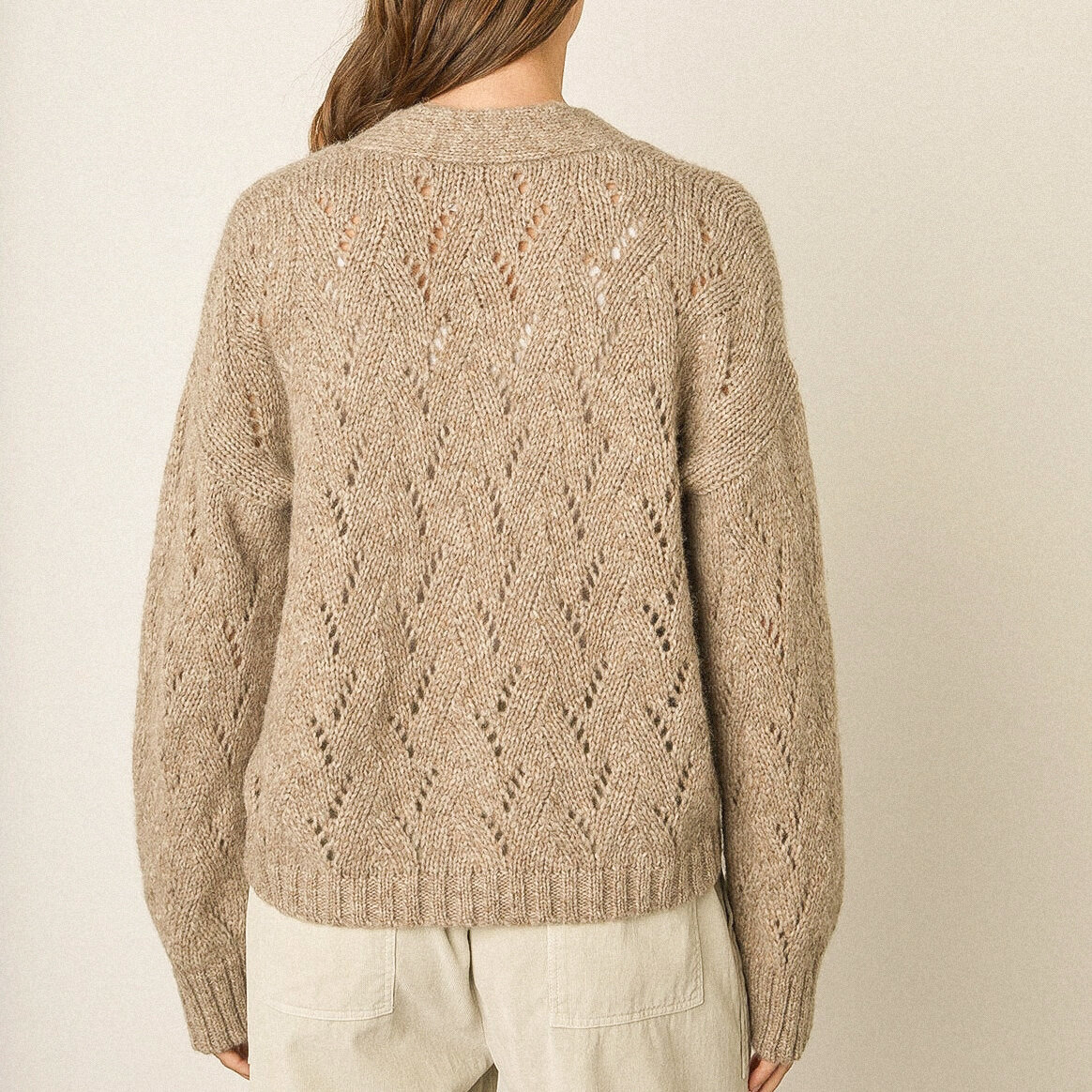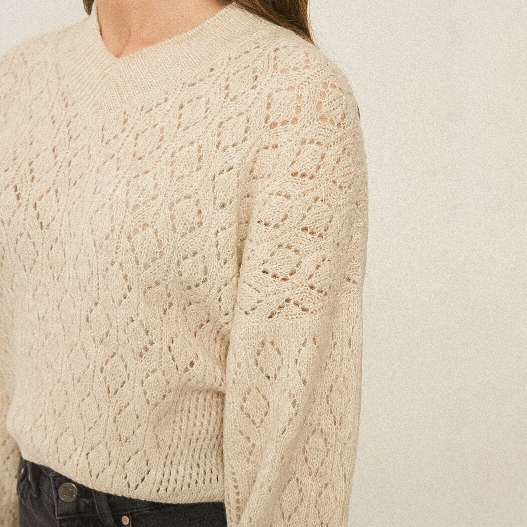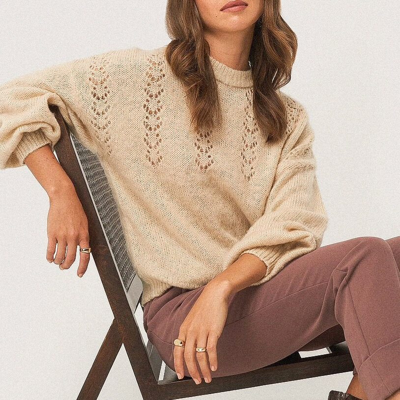 Джемпер свободной посадки с круглой горловиной и спущенными плечами, выполнен лицевой гладью и ажурными дорожкам в области кокетки.