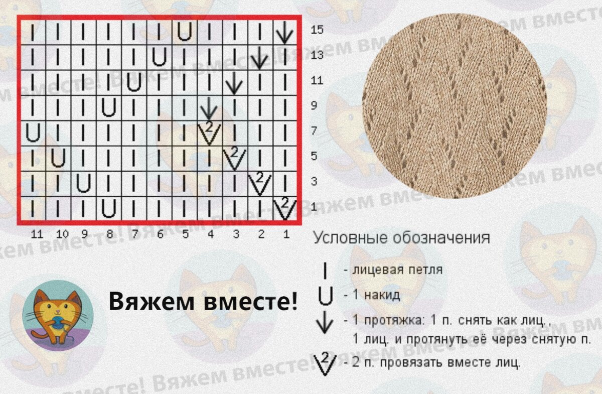 При вязании узора следите, чтобы убавления выполнялись с наклоном в нужную сторону, от этого зависит конечный вид узора. Стрелочка обозначает наклон влево, а галочка — наклон вправо.