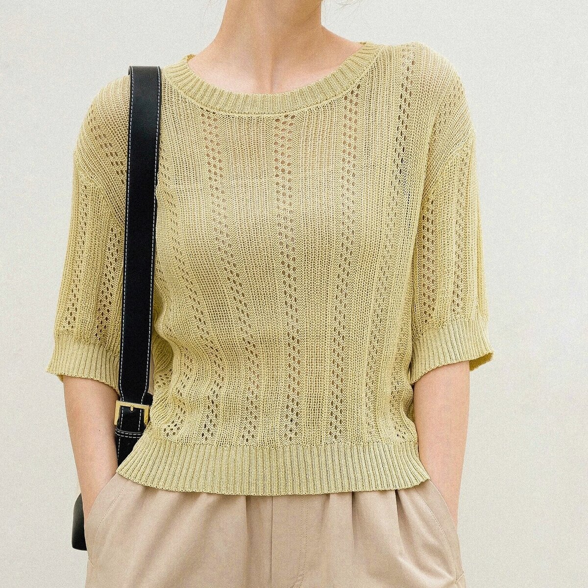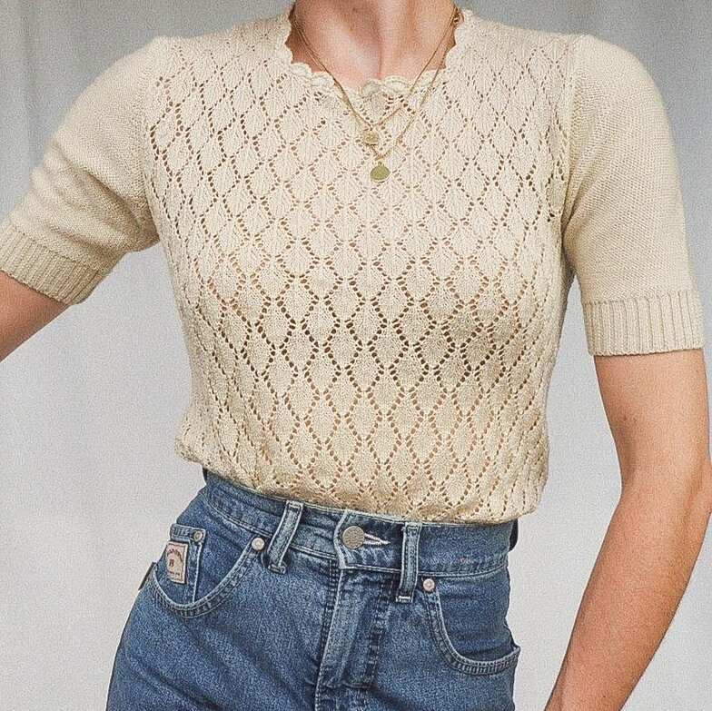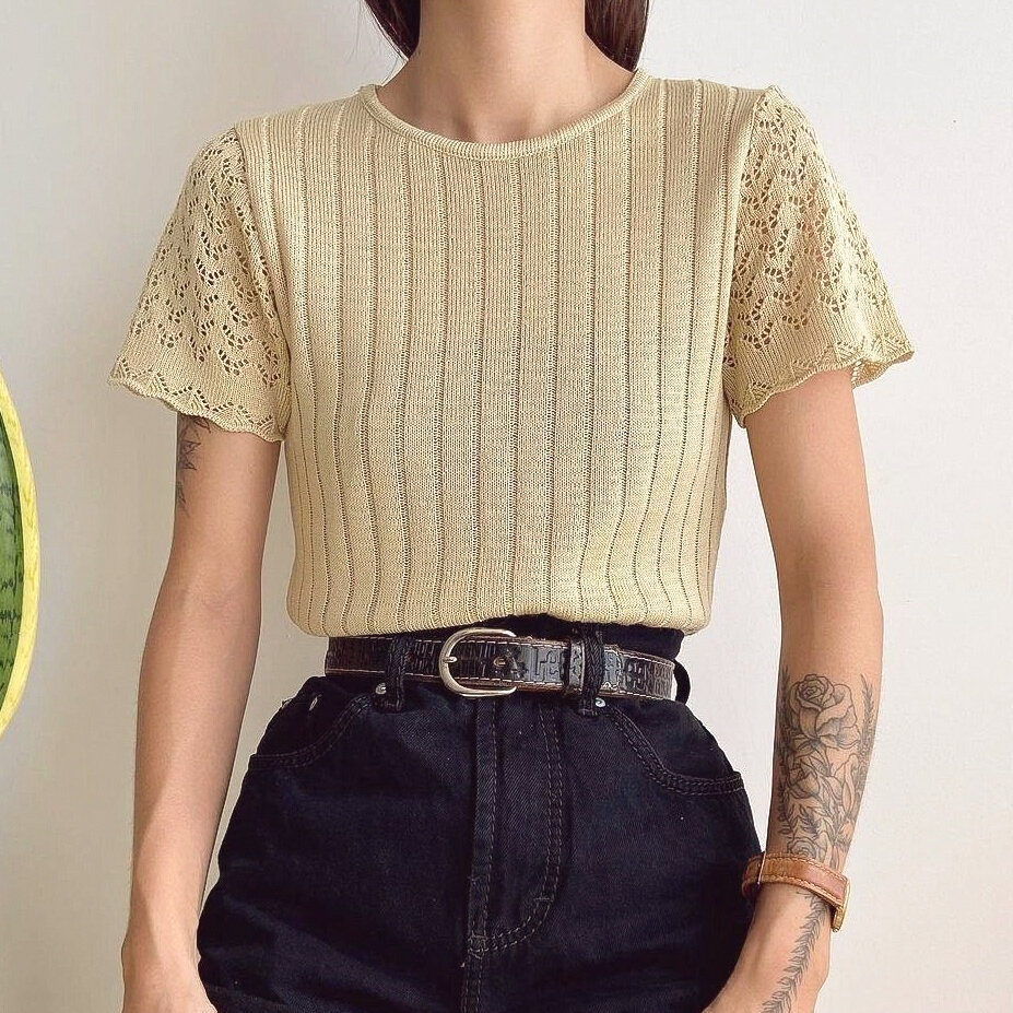 Топ в цвете охры с ажурным узором в виде листьев по низу. Приятная совсем не перегруженная узорами модель, но с сохранением индивидуальности.