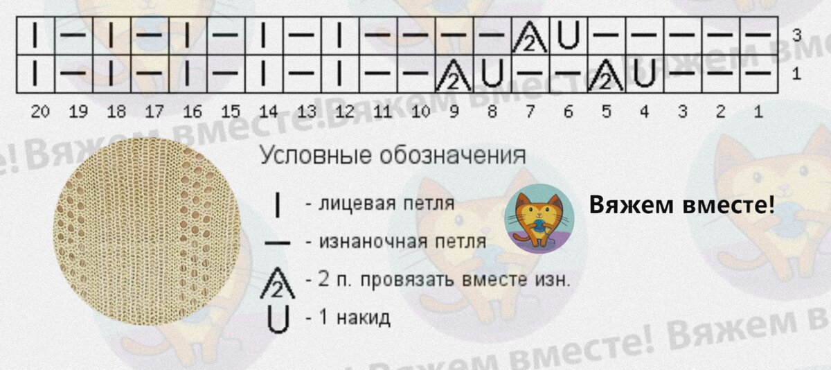 На схеме дан один раппорт узора и только лицевые ряды, изнаночные вяжутся по рисунку петель на спице.