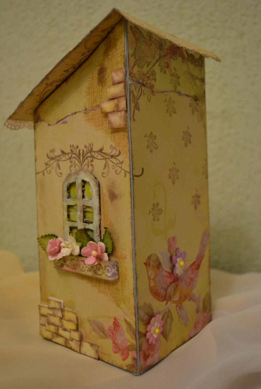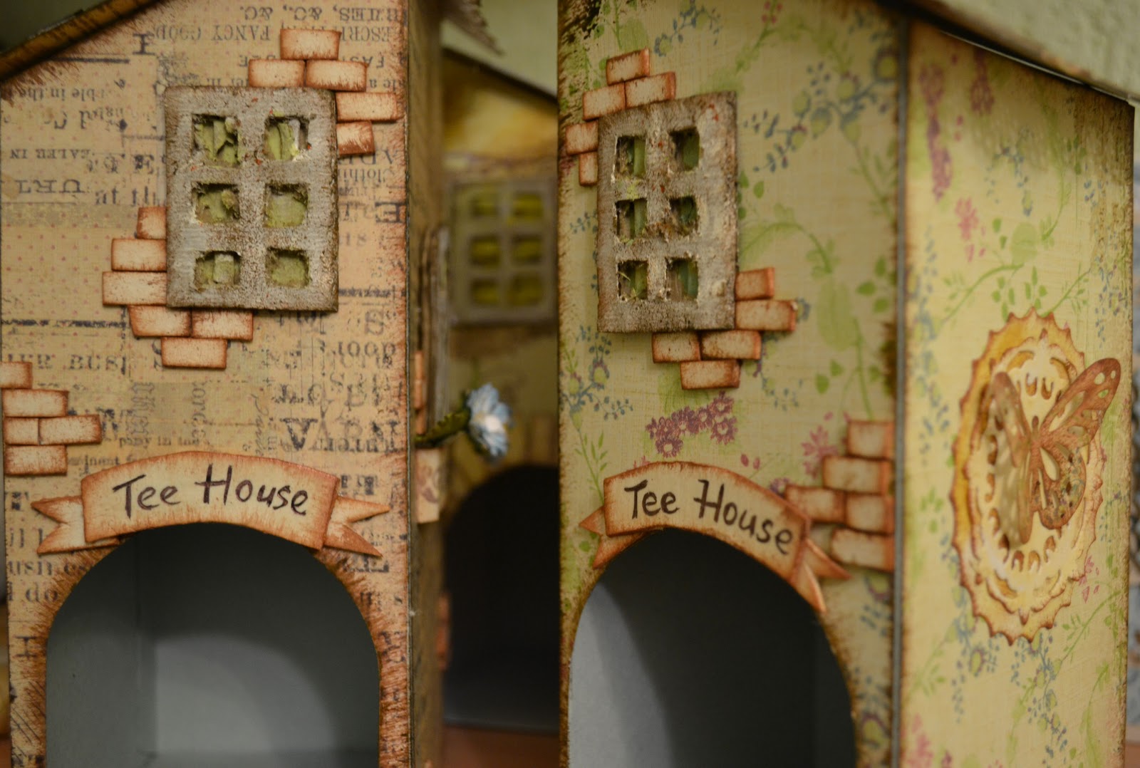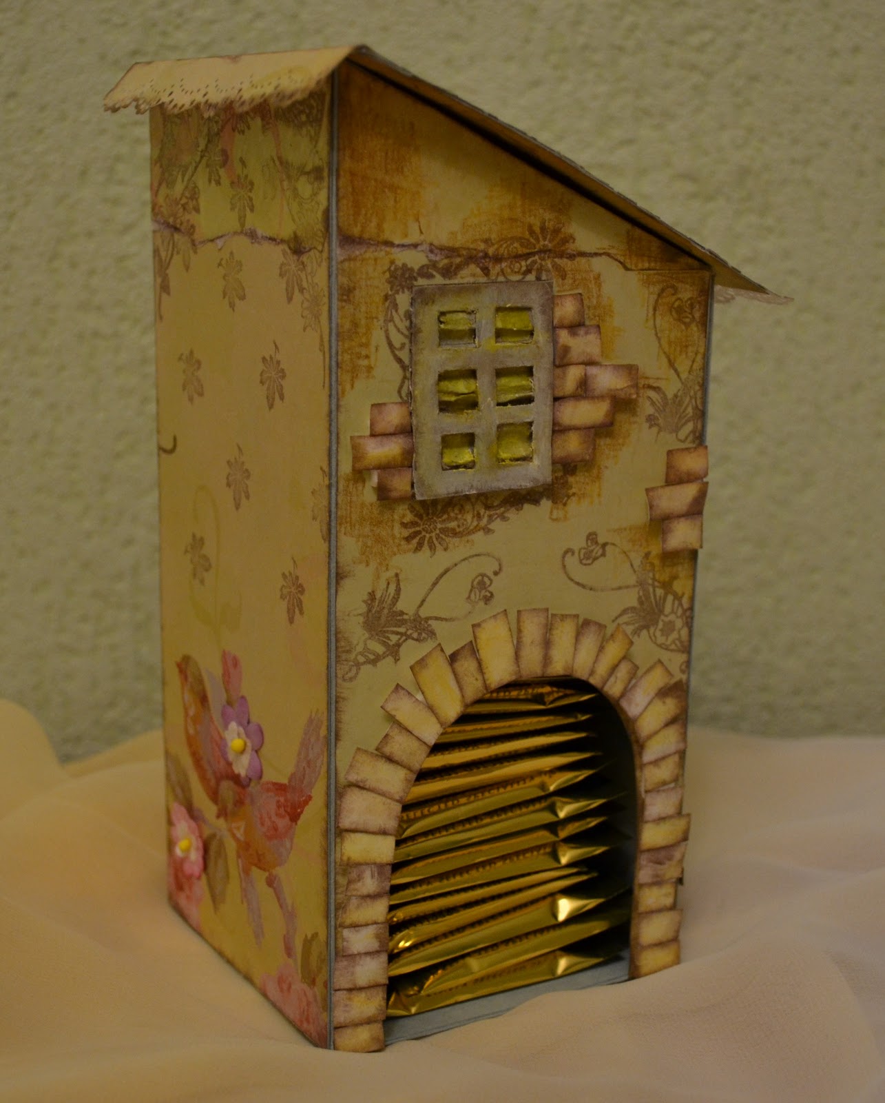 Видела на просторах интернета вариации на тему чайных домиков, руки у самой давно "чесались" на данную тему. Делала в подарок. Каждый кирпичик вырезался, тонировался, клеился на объемный скотч. Затем под руки попался кусочек 2мм картона, и следующая партия кирпичей уже изготавливалась из него))). "Стеклопакеты" из гофрокартона))). А так в общем то всё видно и понятно - что из чего))).