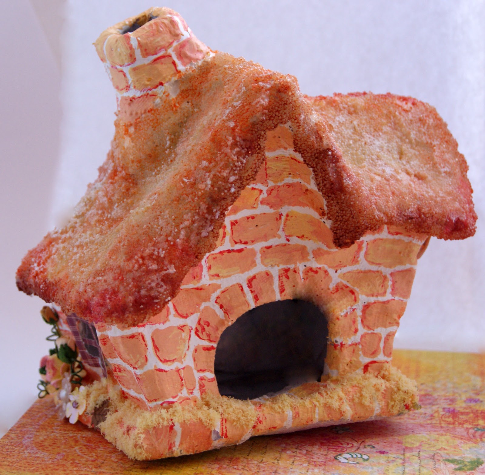 Домик сделан из папье-маше. Есть у меня чудесный керамический подсвечник в виде такого домика. Перекрашивать его в оранжевый я не решилась и сняла с него бумажного "двойника".