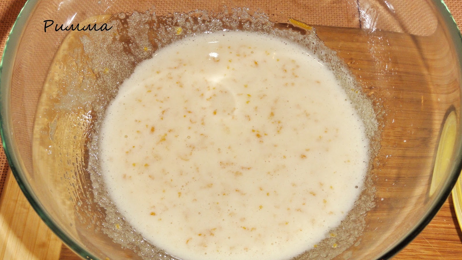 Снять цедру с апельсина с помощью терки. Яйцо взбить вилкой с сахаром и цедрой.