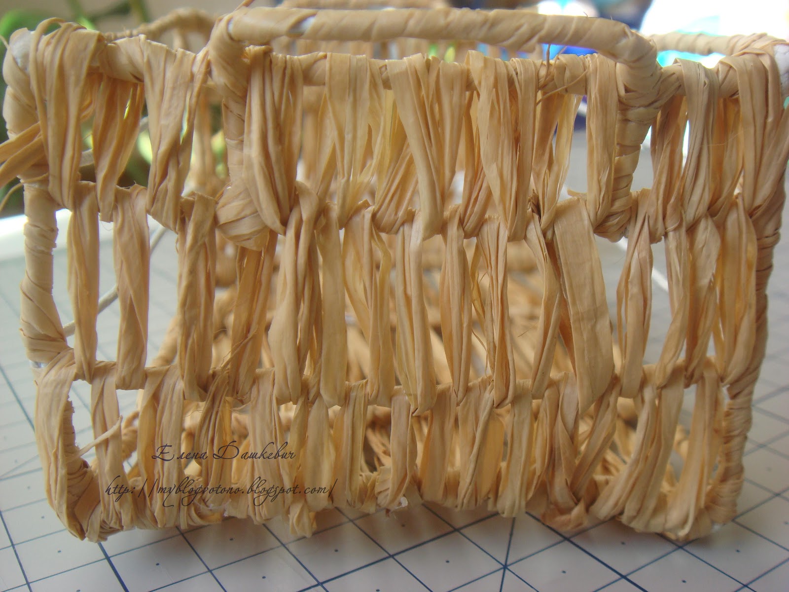 Дальше начинаем "плести" корзиночку. Я просто обматывала рафией каркас (как на фото) от верхнего прямоугольника (со стороны ручки) вниз, через дно и вверх до противоположной стороны и назад - таким образом захватывала 2 боковые стороны и дно. Можно обматывать вокруг, а дно потом или любым другим способом.