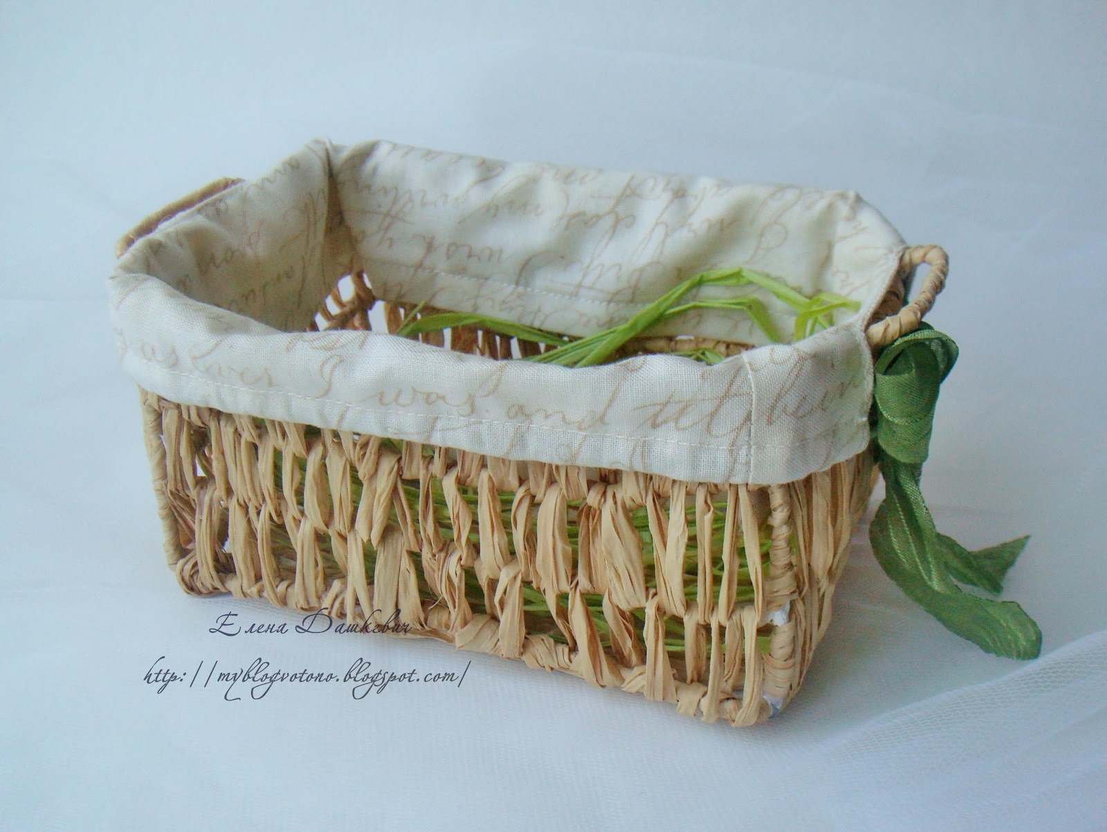 На дно корзиночки я положила немного зеленой рафии,
