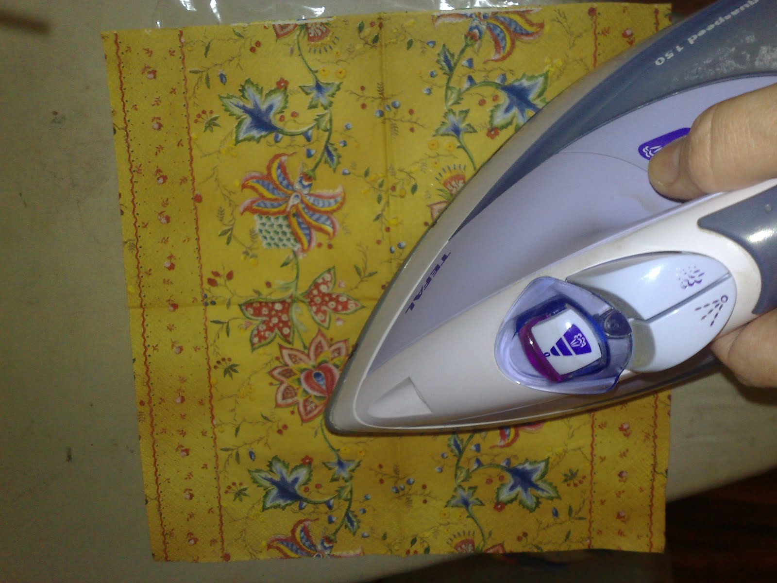 Для этого можно воспользоваться клеем для декупажа, но для ускорения процесса можно воспользоваться пищевой пленкой и утюгом: