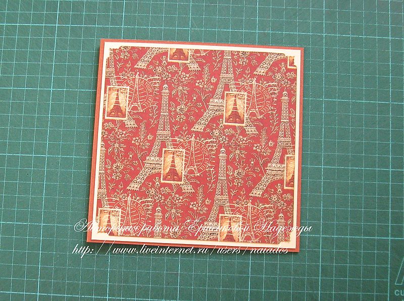 3. Из светлого картона вырезаем квадрат размером 14,5 см х 14,5 см, из листа скрапбумаги квадрат размером 14 см х 14 см.
