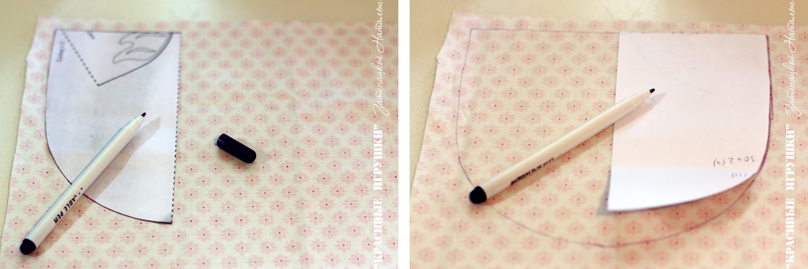Нижняя внешняя деталь сумки. Для начала распечатываем выкройку сумки на листе А4, вырезаем ее и, положив на изнаночную сторону ткани Lining Pink, обводим исчезающим маркером для ткани. Поскольку выкройка дана в виде половины детали, то мы дублируем выкройку на вторую половину ткани, как показано на правом рисунке: