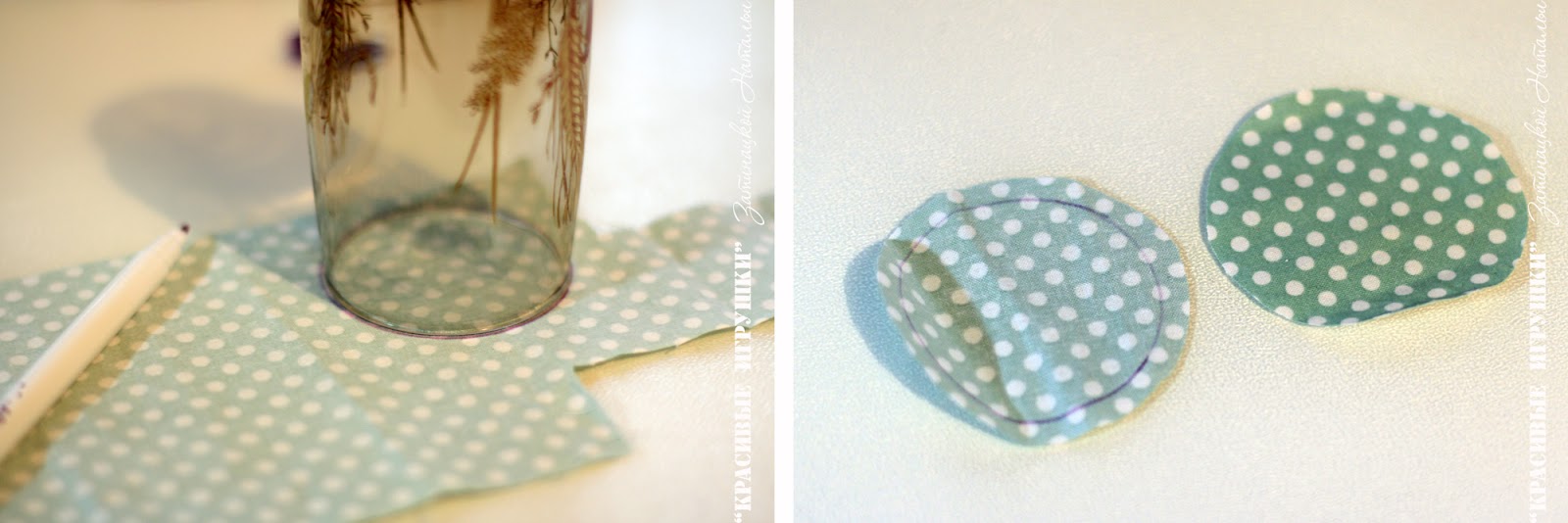 Берем ткань Dottie Surf Green и любой стакан нужного вам радиуса. С помощью маркера для ткани обводим стакан на изнаночной стороне ткани и вырезаем деталь с учетом припуска на швы 0,5 см. Деталей должно быть 2 шт.