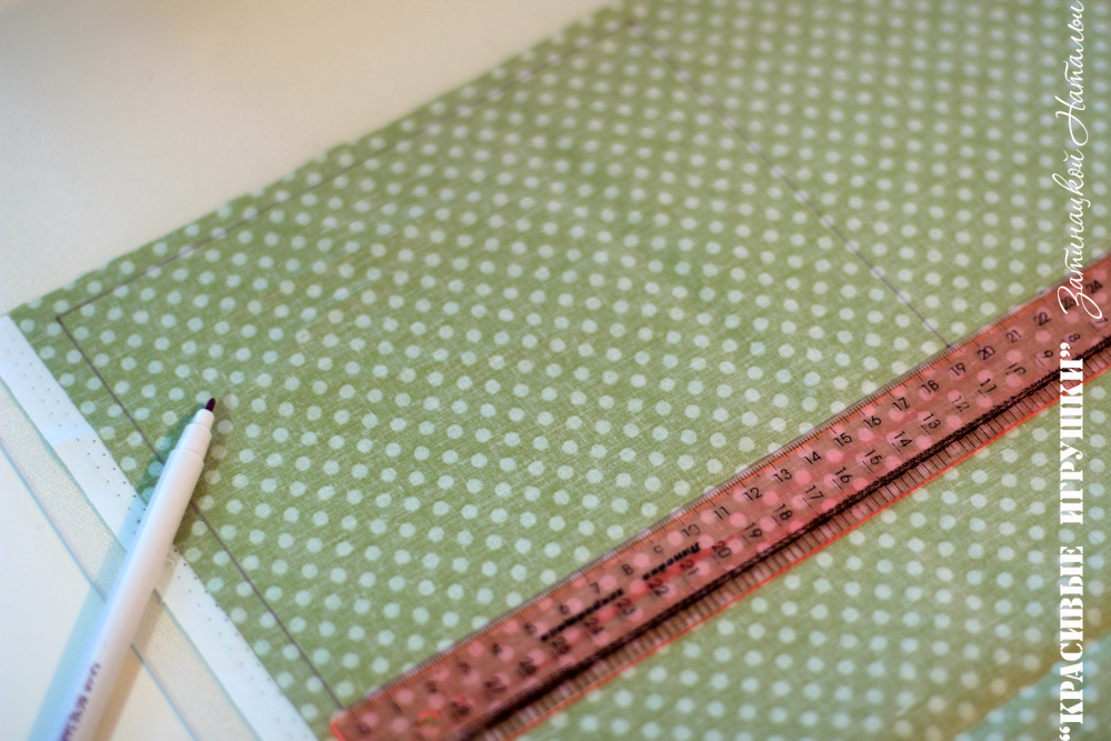 Верхняя деталь сумки. Замерив ширину нижних деталей сумки я получила цифру - 19,5 см. Соответственно, ширина верхней детали будет 19,5 см. Проводим линию на изнаночной стороне ткани Dottie Green с помощью линейки и маркера до указанной цифры.