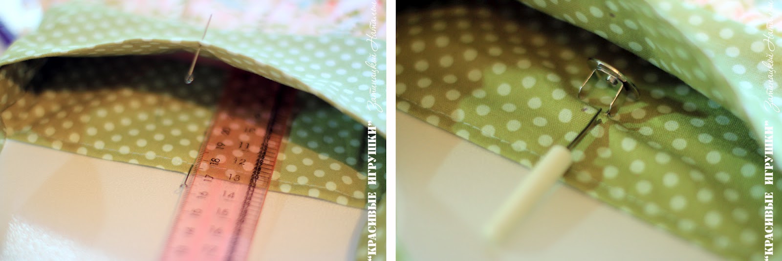 Пришиваем ручку к сумке. Для этого по центру шва закрепляем булавкой край ручки (аналогично - с другой стороны сумки) и прострачиваем, как показано на рисунках:
