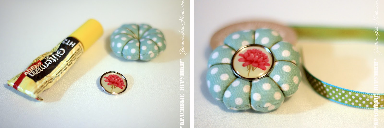 Брошка "цветочек-тыковка" делается аналогичным образом, как и цветочек на сумку, только на заднюю ее часть прикрепляется с помощью текстильного или любого другого клея булавка.