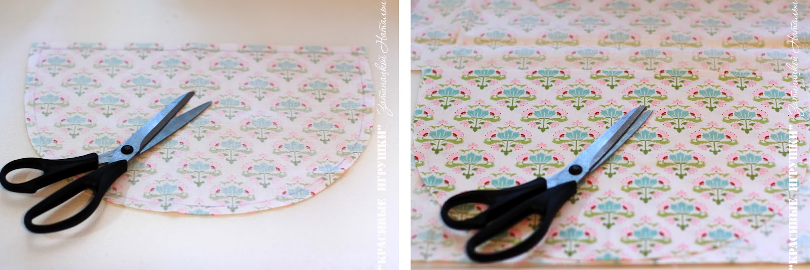 Вырезаем деталь с учетом припусков на швы 0,5-1 см, затем кладем изнаночной стороной к изнаночной стороне ткани, закрепляем булавками и вырезаем. Таким образом, две детали нижней подкладочной части сумки готовы: