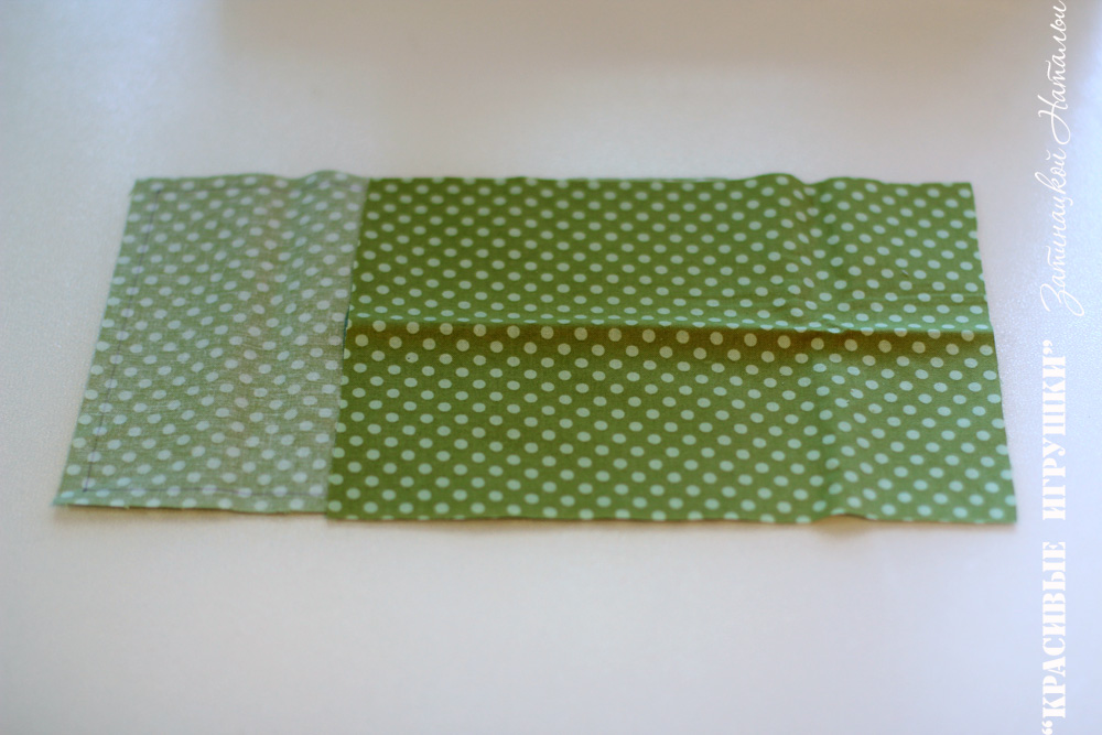 Сшиваем кармашек. Для этого складываем две детали кармашка лицевой стороной друг к другу и стачиваем верхнюю его часть: