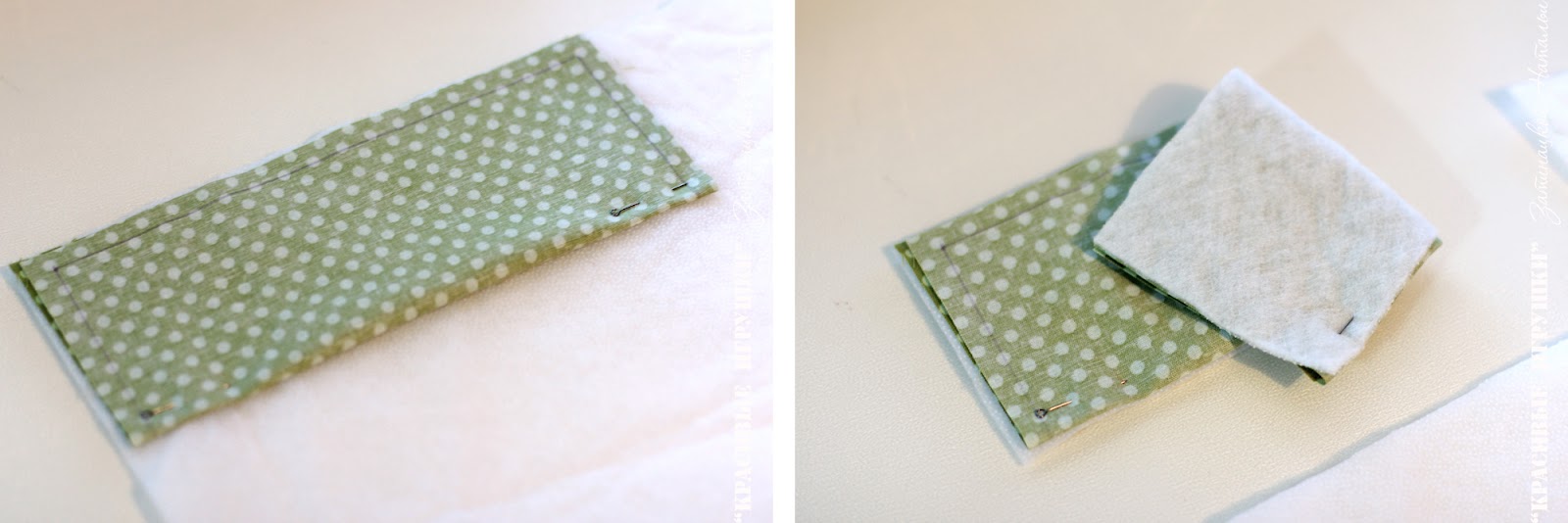 Для большей плотности (и красоты :) кармашек у нас состоит из двух деталей. Мы складываем их лицевой стороной друг к другу, закрепляем булавками и стачиваем, оставляя проем в 3 см в боковой его части для выворачивания наизнанку: