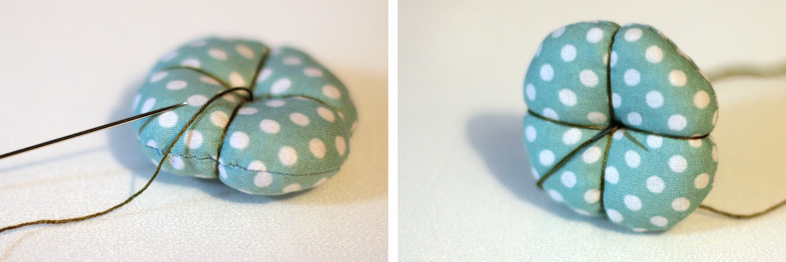 Берем нитки мулине зеленого цвета и начинаем формировать "лепестки" тыковки. Но сначала отмечаем центр цветочка и прошиваем в этом месте несколько раз. Ниже представлена серия фотографий, как формировать "лепестки":
