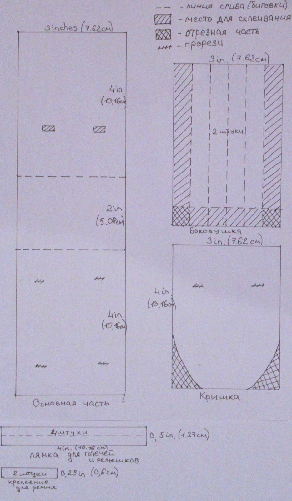 Затем нужно прорезать отверстия для ремешков на сторонах рюкзачка и вставить их в отверстия, как это показано на схемке и на рисунках. Затем на изнаночной стороне приклеить к поверхности рюкзачка: