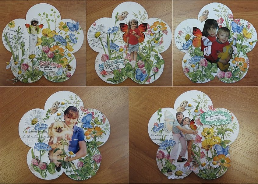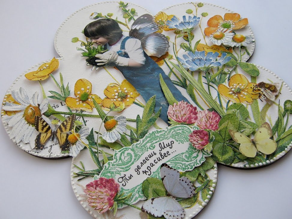 12. Цветы и голубей вырезаем дыроколами. Лепестки цветов яблони подкручиваем любым инструментом, имеющим твердый скругленный край. Я это делаю иглой, которой вставляют резинку, - у нее шарик на конце. Цветы в траве: лепестки подкручиваем, потом переворачиваем цветы и нажимаем тем же шариком в серединку. Декорируем цветы микробисером, или бисером, или акриловым контуром и т.п. Приклеиваем цветы и голубей - на ветки и на траву.