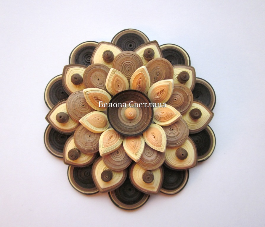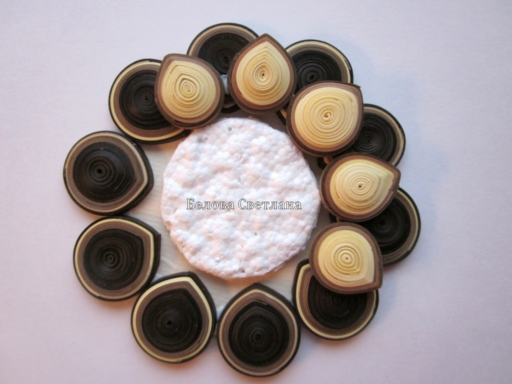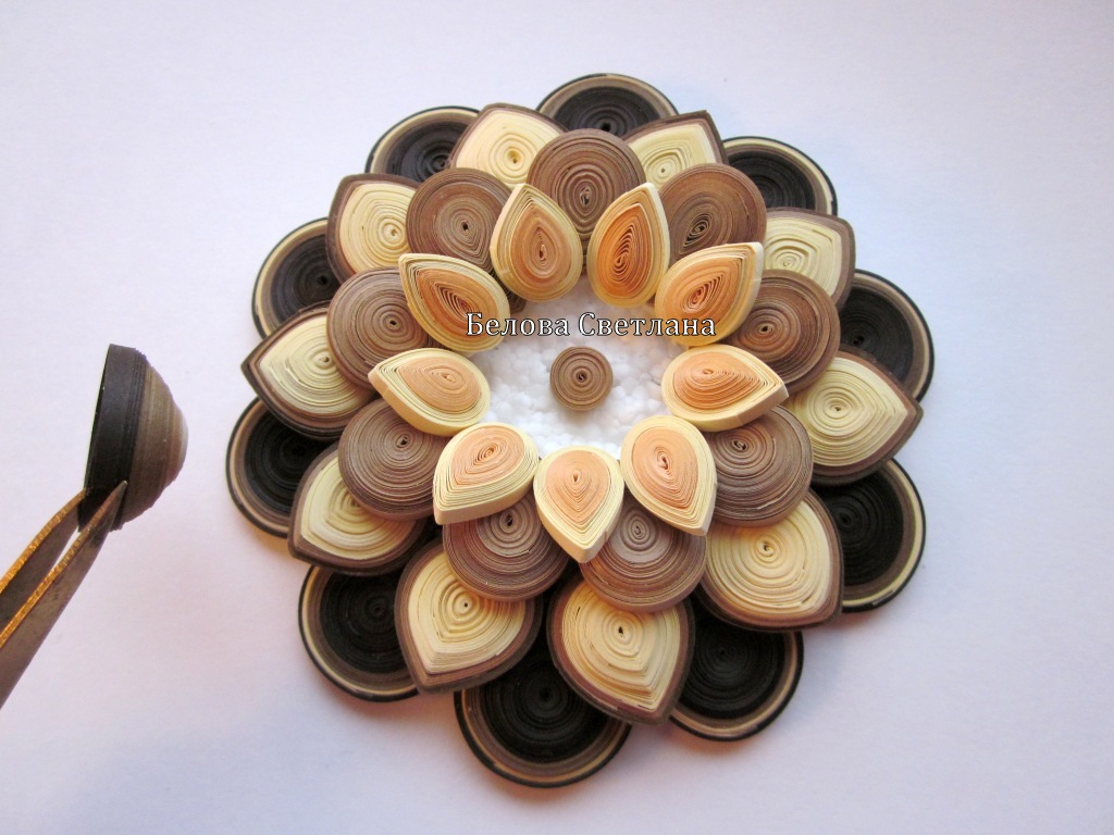 предыдущих и острым краем наружу...В середину углубления положите скрученный ролл из одной полосочки, шириной 1.5мм -- для устойчивости последней центральной детальки. Для неё соедините 11 полосочек с плавным переходом цвета от светлого к тёмному, придайте форму чашечки (как на фото) и вставьте в углубление.