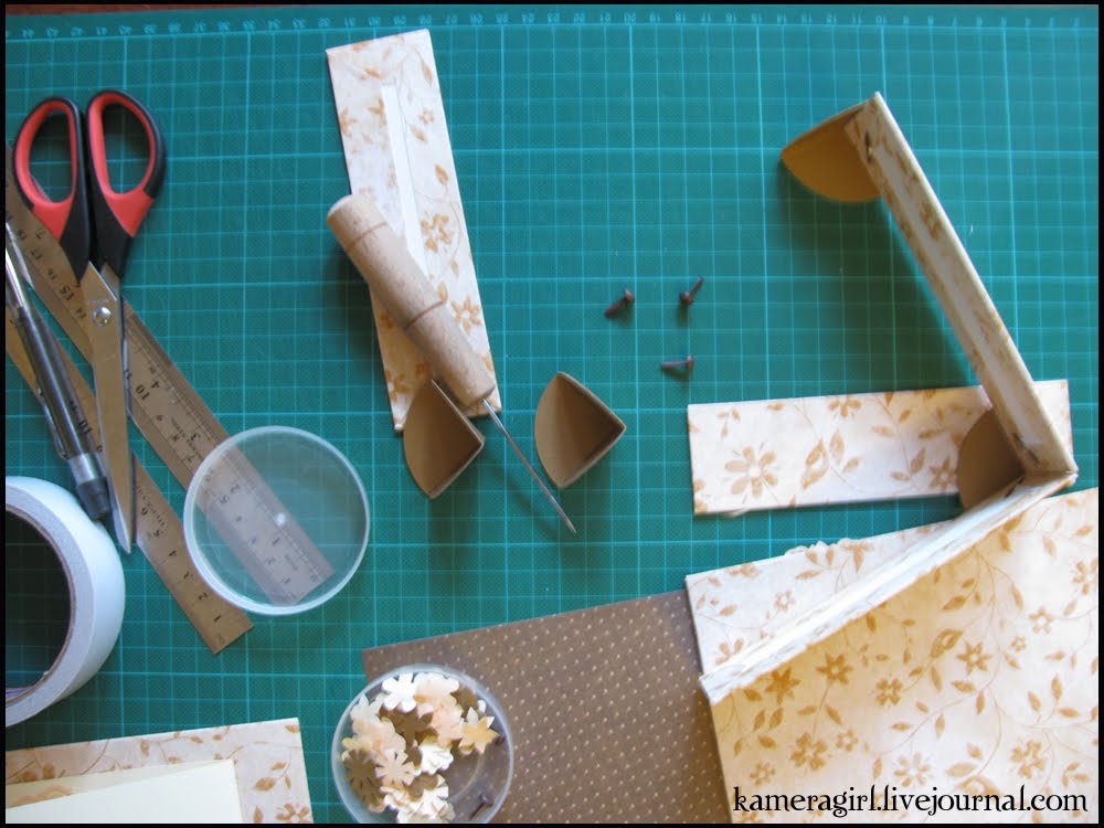 Потом я нарезала бумагу и начала оборачивать детали моей коробочки вот таким образом, используя двусторонний скотч для приклеивания бумаги к основе.