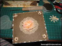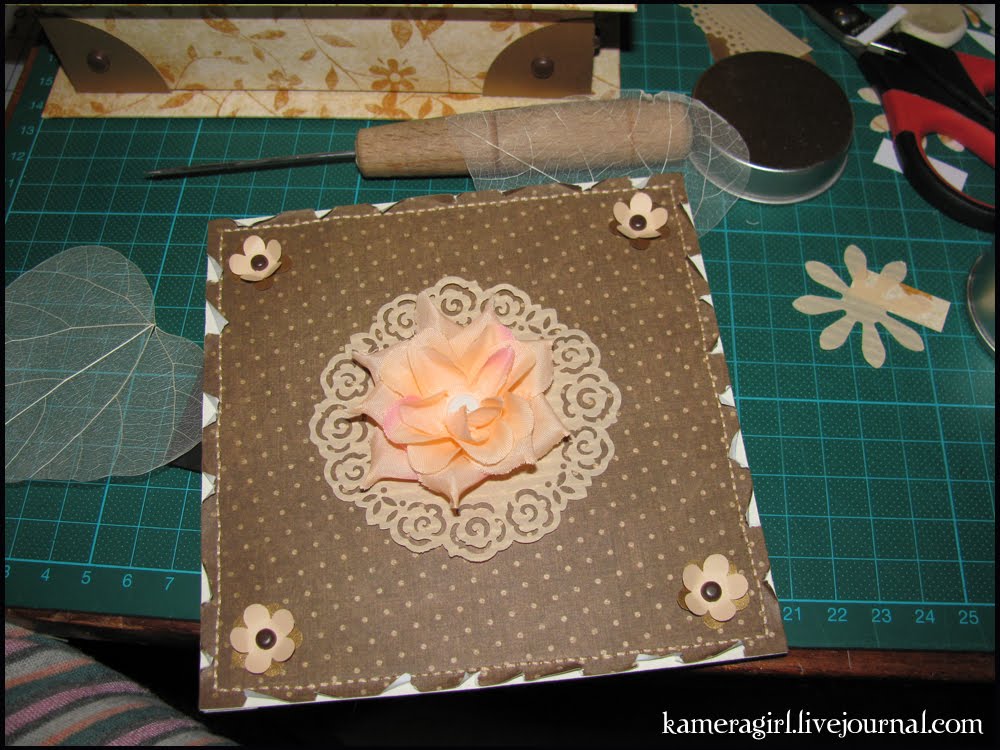Крышку крепим тоже на брадсы, сначала прикладываем каркас коробки к внутренней стороне крышки, а потом прокалываем шилом отверстия посередине ленточных полосок и продеваем брадсы. Я на брадсы, для красоты, надела цветочки.