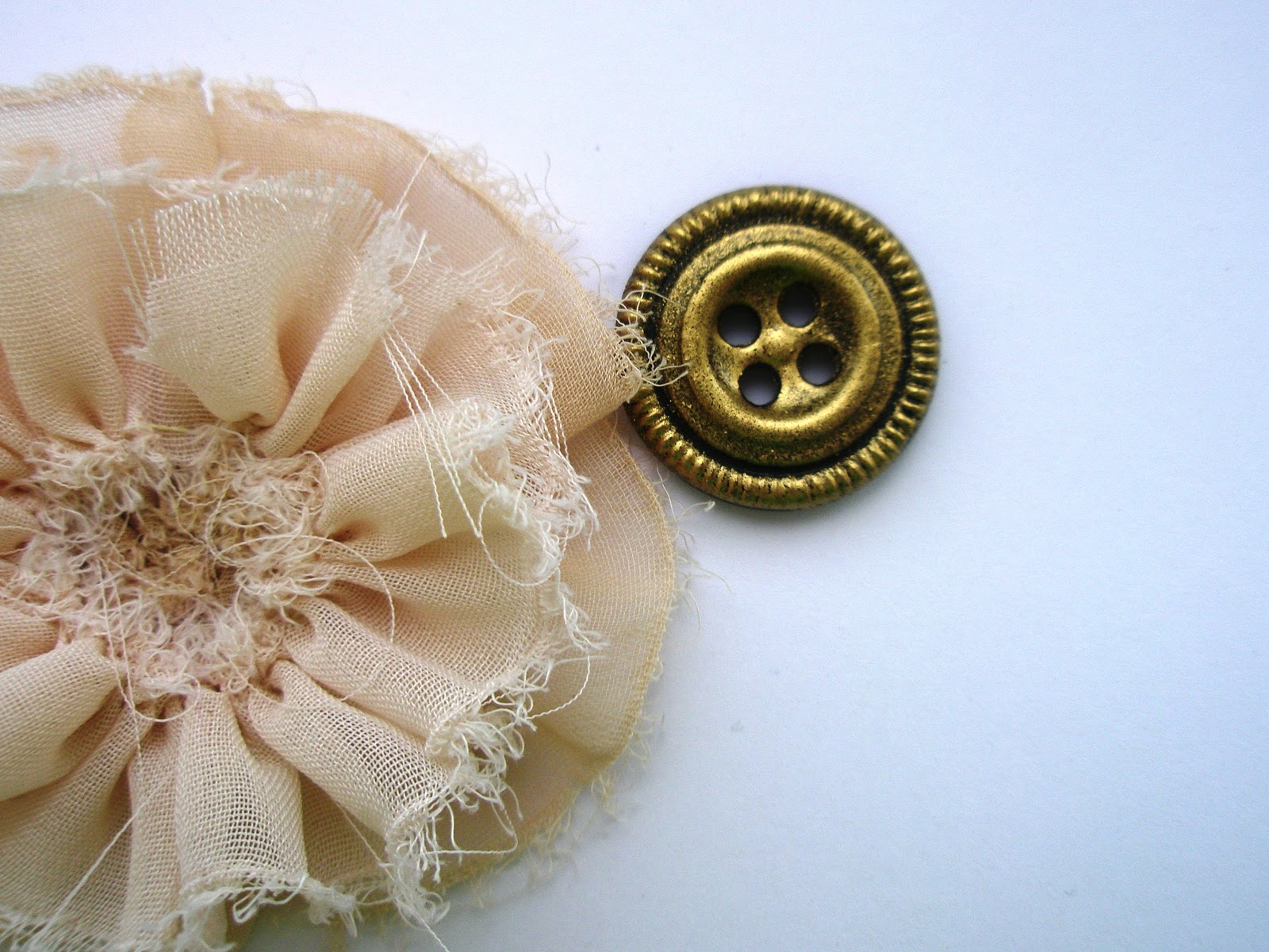 Для серединки цветка взяла две пуговицы. Т.к. у меня небыло подходящей по цвету пуговицы, то я черную пуговицу макнула в чернила для эмбоссинга, посыпала золотой пудрой и расплавила пудру феном.