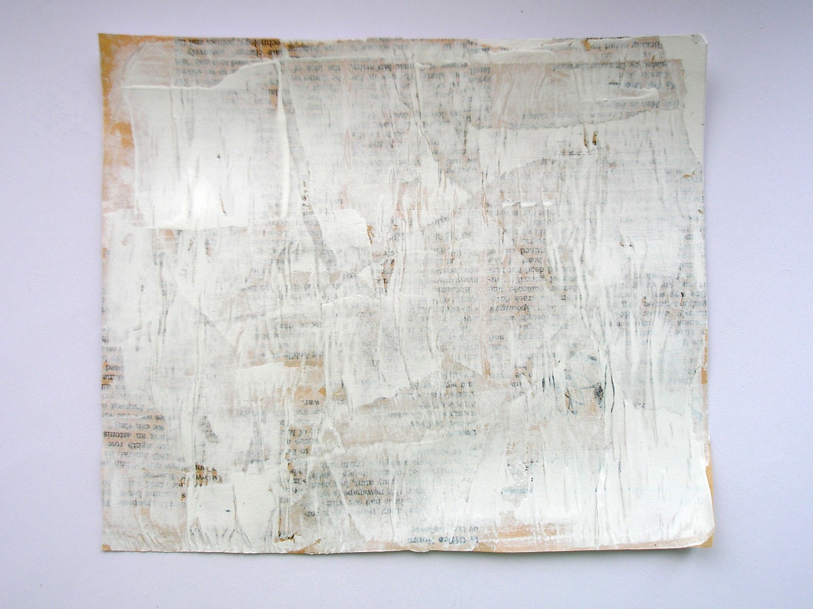 Для изготовления фона взяла кусок акварельной бумаги, на который наклеила клеем ПВА кусочки газеты, с помощью карточки нанесла белый акрил на газету, не полностью покрывая ее, чтобы буквы просвечивались. Газету я взяла розоватого цвета с качественной бумагой и печатью такой, что буквы не размазываются при попадании влаги. Вот такую: