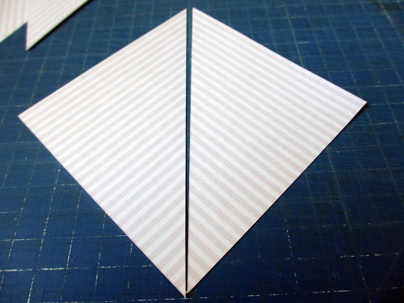 4.Два отрезанных треугольника складываем и склеиваем таким образом, чтобы полоски рисунка образовали прямой угол: