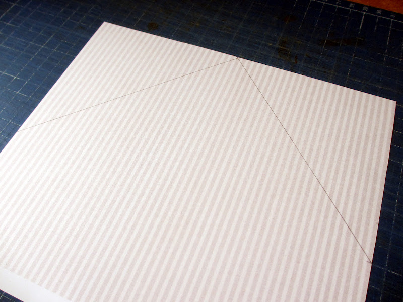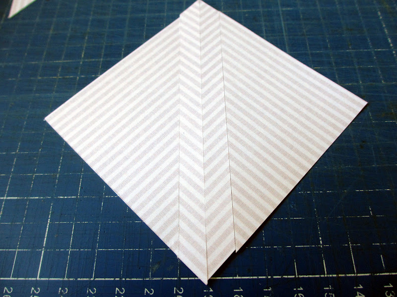 5.От полученного после склеивания квадрата снова отрезаем два треугольника. Линии отреза должны быть параллельны диагонали с одинаковым отступом (скажем, 1 см.) от диагонали в обе стороны таким вот образом: