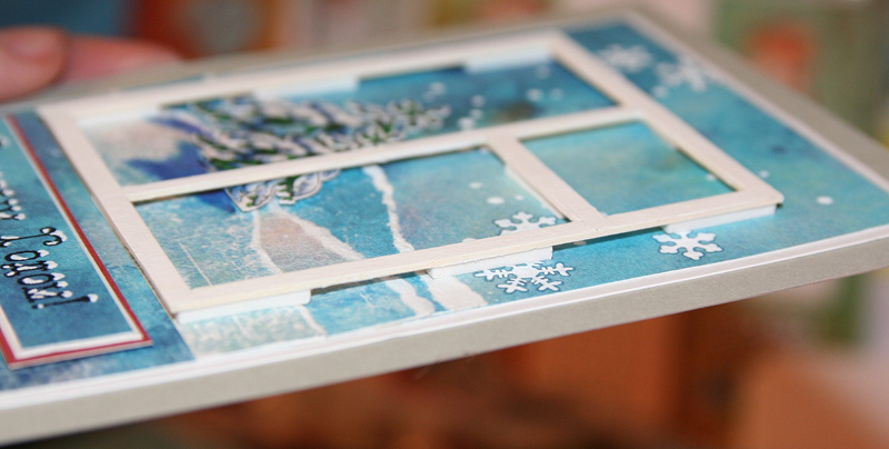 Из третьей полоски я сделала открытку со снеговиком, которого я нежно люблю уже третий год.В дополнение к снеговику сделался забор.Снеговик и забор приклеены на объемный скотч. Для пущей достоверности дорисованы тени от снеговика и от забора: