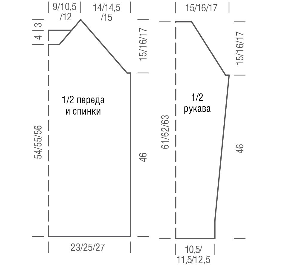 Через 46 cм = 102 р. от наборного ряда закрыть с обеих сторон 1 раз по 3 п., затем в каждом 2-м р. 1 раз по 2 п. и еще 15/16/17 раз по 1 п. = 14/16/18 п.