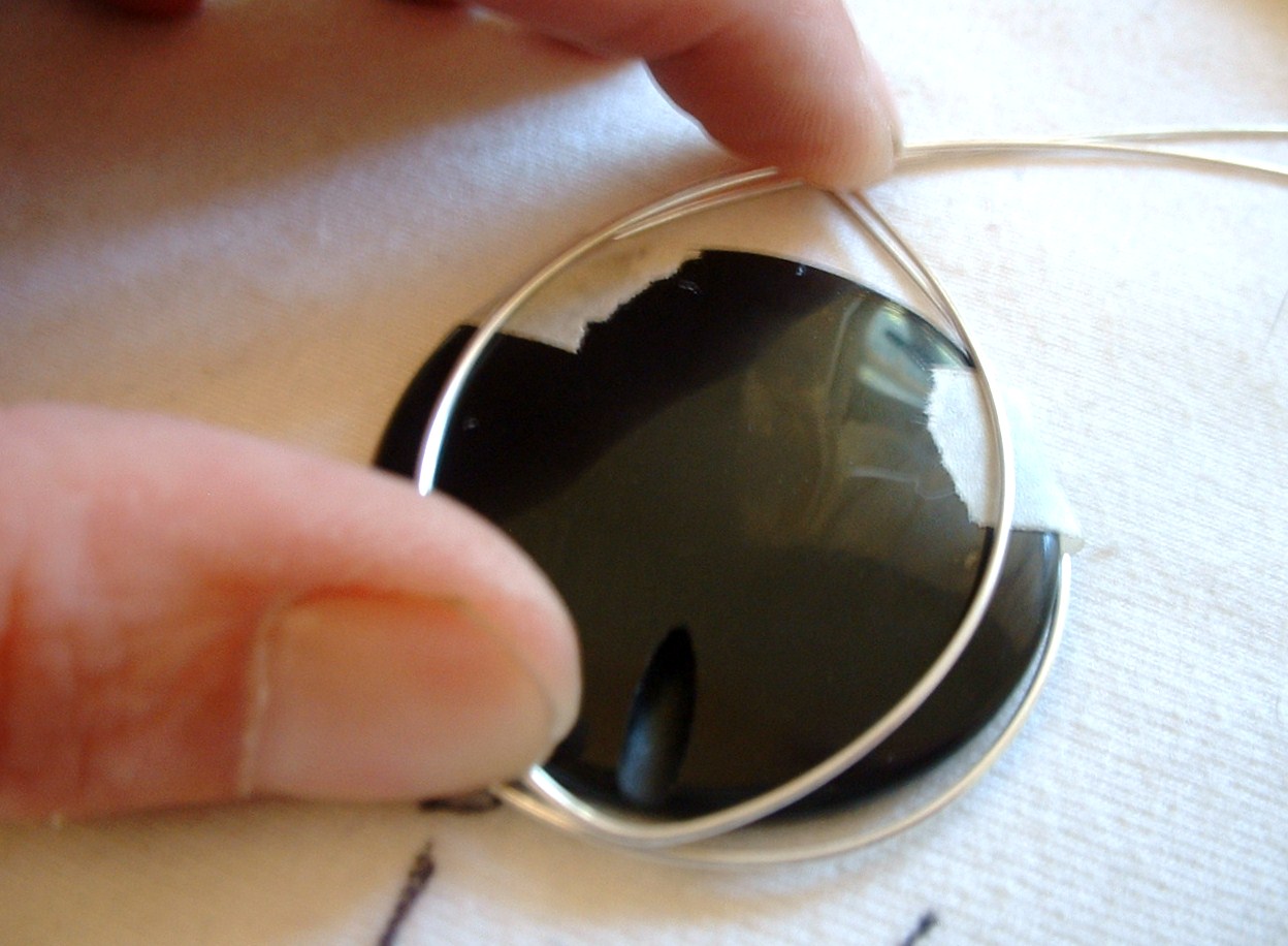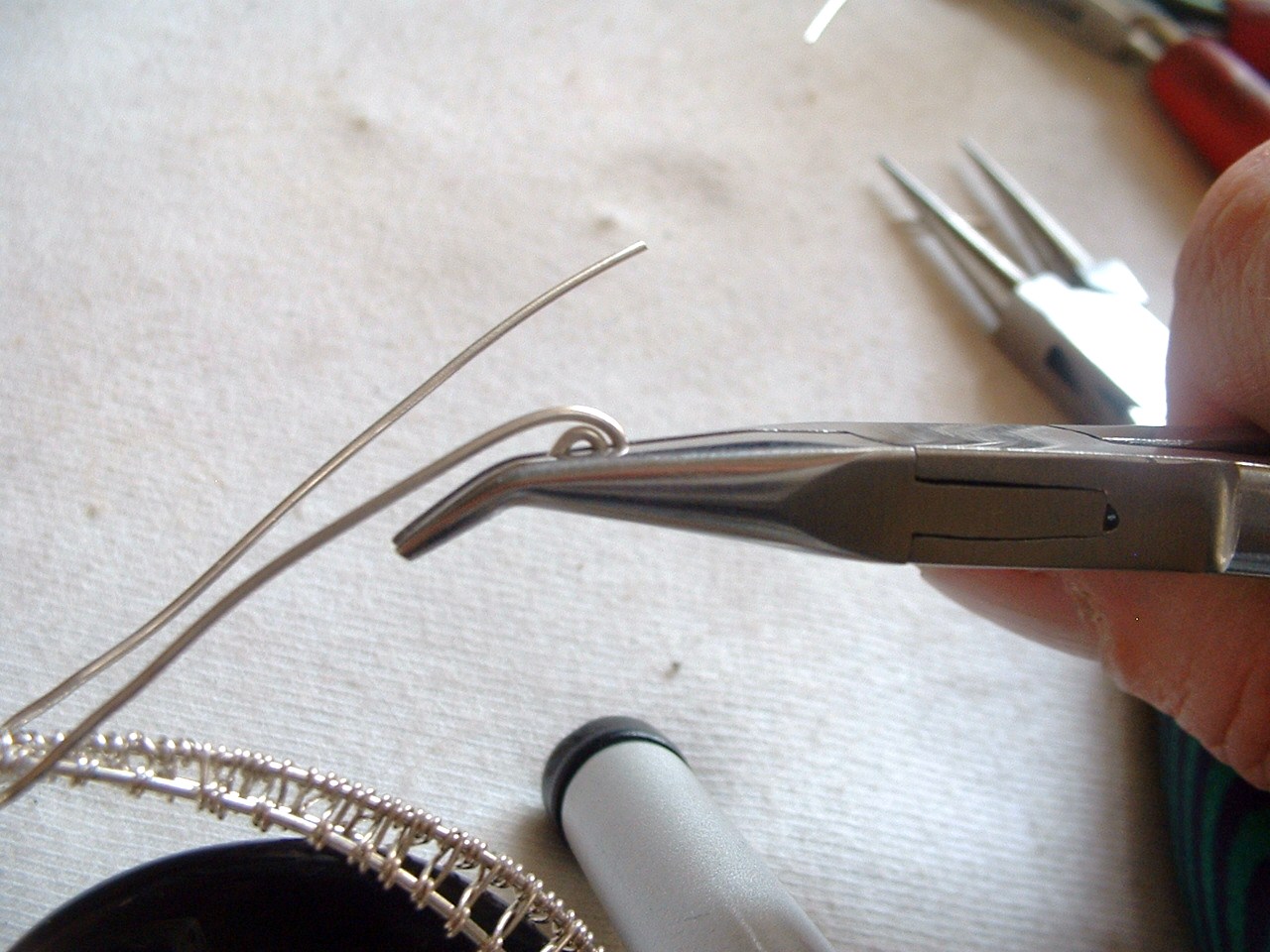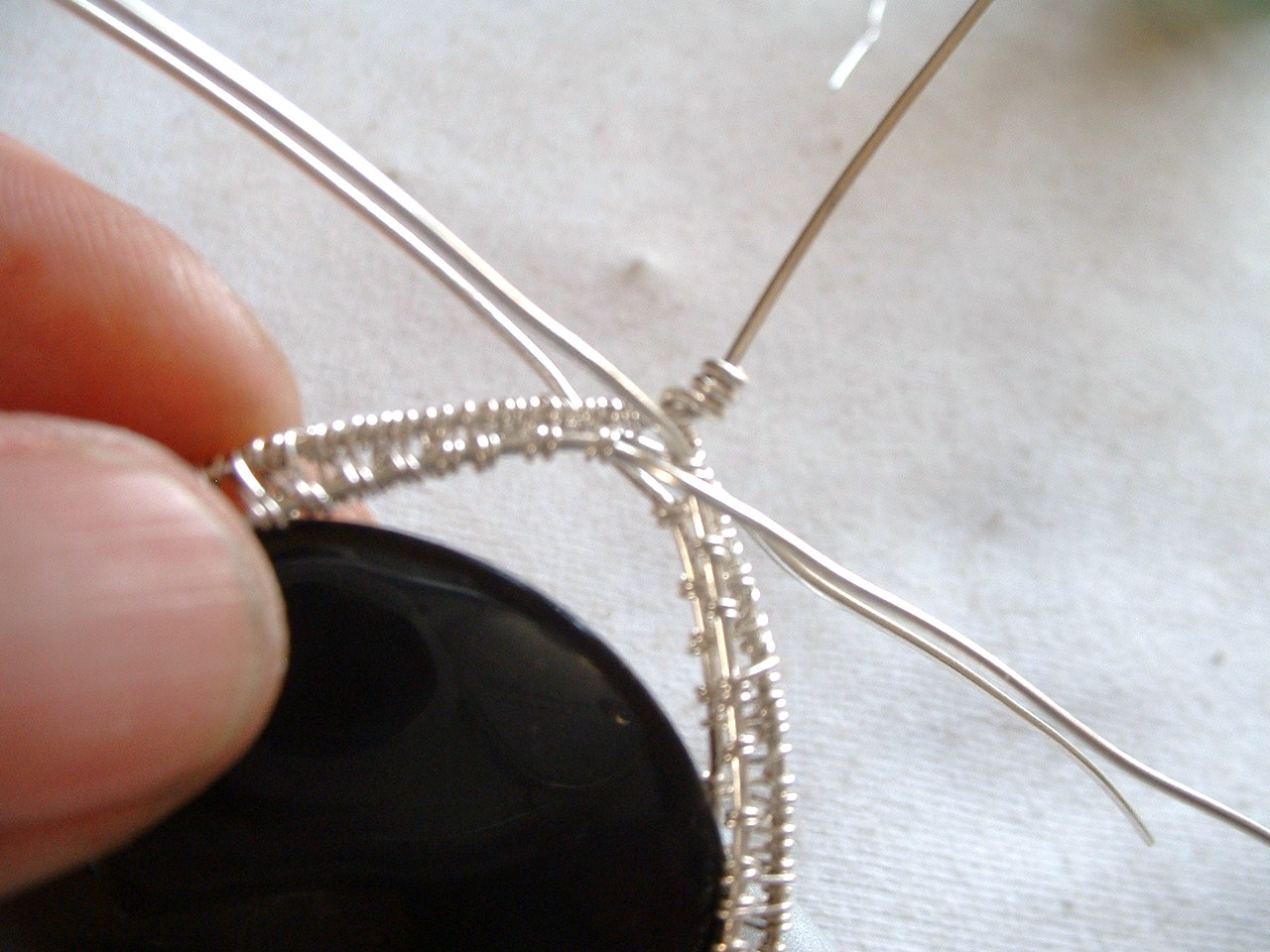 Затем разрезать еще 2 20г провода такого же размера, так как это первая работа кадр и сделать свободным формированием круга. Мне легче провести 2, а форма, в то же время continuity.At центре нижней дать 2 провода небольшой щепоткой создать мягкую точку. Кривыми должны быть немного меньше, чем первоначальный диаметр .. установить каждый кусок нового провода от фокусного и нажмите осторожно, чтобы формировать с лицом кривой камень / шарик. Эти два провода будет записано на пленку в месте внизу в центре. Один на передней панели и один на задней панели. Это будет клетка координационного когда он тканые, и убедитесь, что спина очень тоже.