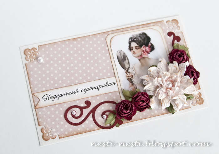Подарочные сертификаты, соответственно, должны быть тематическими. Ну как устоять перед красотой, поэтому на сертификатах появились прелестные женские образы, и много-много цветов: гардении, розы (я продолжаю практиковаться в их изготовлении), и любимый горошек. Сертификаты получались винтажные и очень нежные, я специально делала их разными, ведь все любят, когда подарки индивидуальны, а подарочный сертификат - тот же подарок!