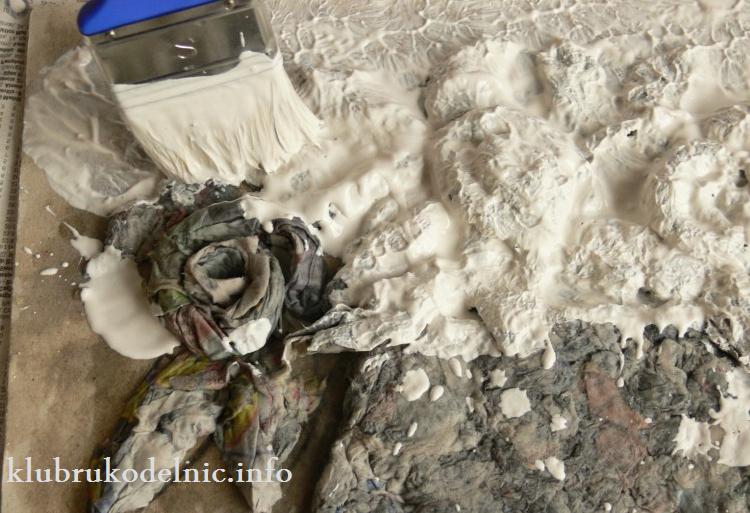 4. Газеты, пропитанные водой, вынем и аккуратно отожмем. Подготовленным клеем намажем основу барельефа и начнем укладывать отжатые газеты на нарисованный эскиз. Можно это делать постепенно маленькими частямии отжимать не все газеты сразу а столько, сколько потребуется на определенный участок.