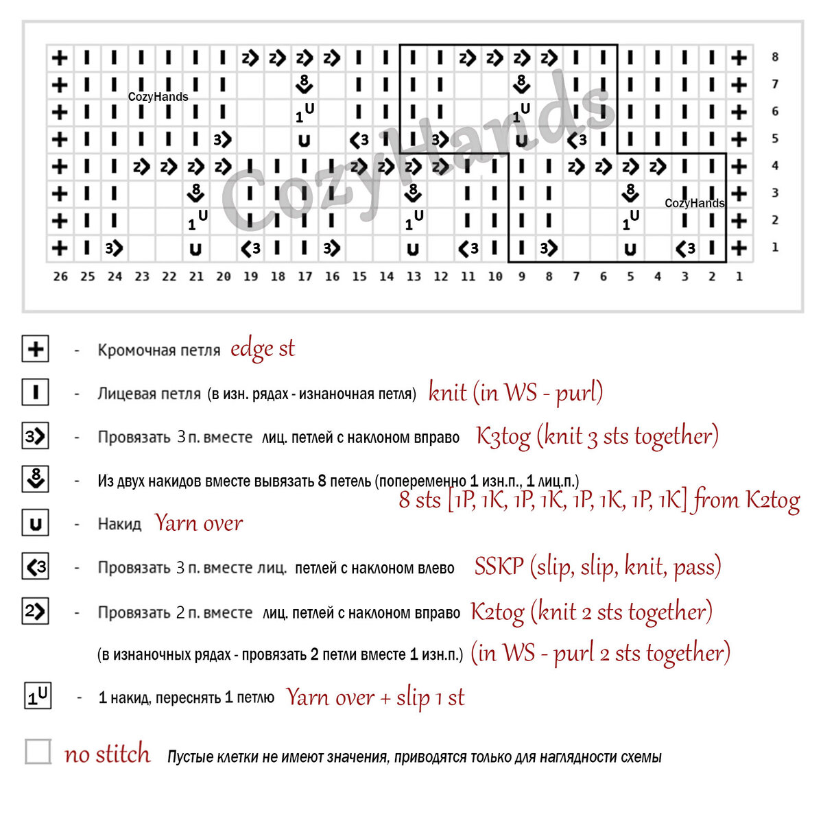 Раппорт узора состоит из 8 петель и 8 рядов.