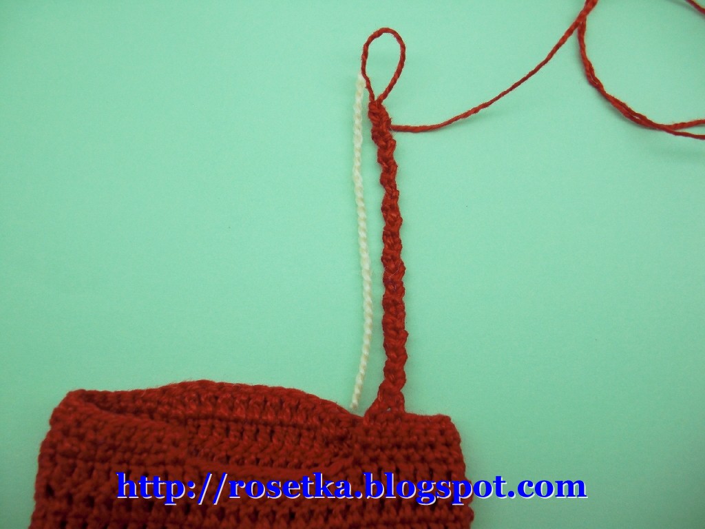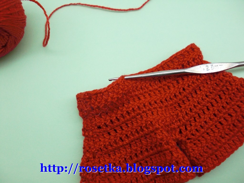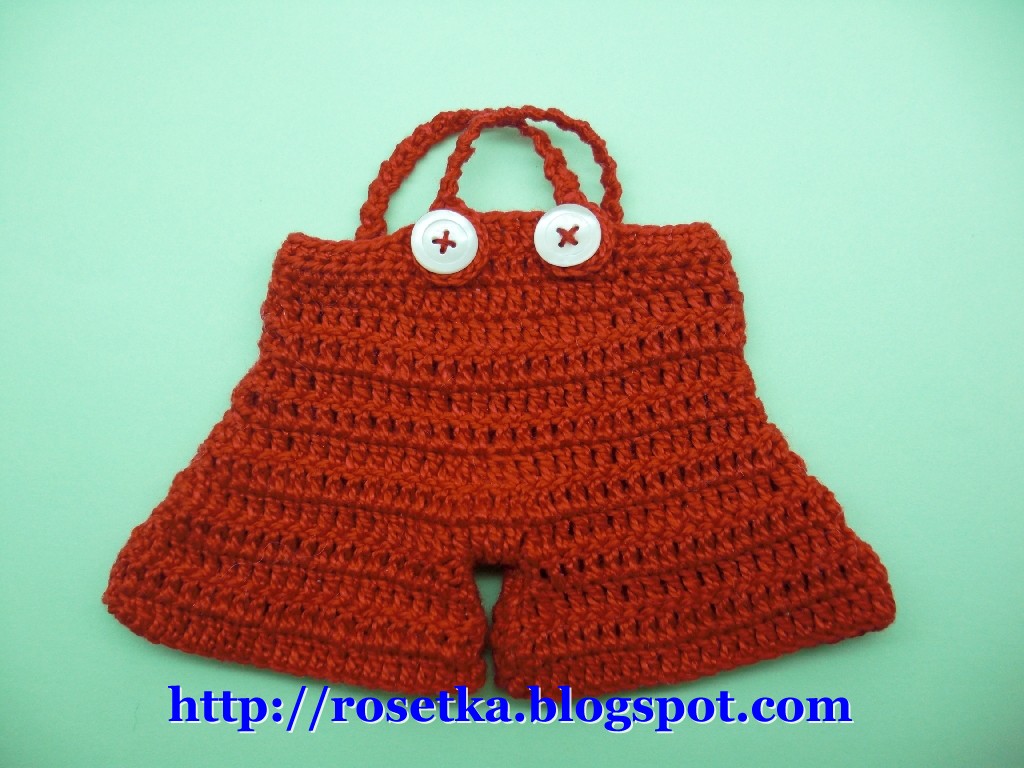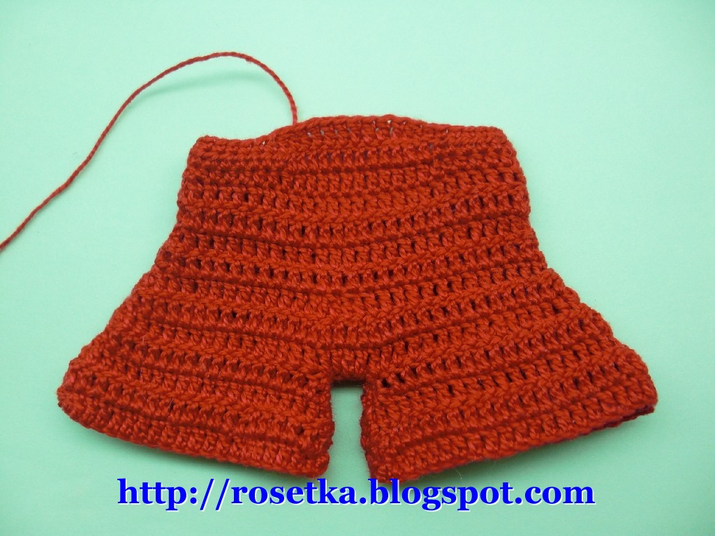 Для этого присоединяем нить к задней части штанишек, ориентировочно к 8-му по счету столбику от бокового шва.