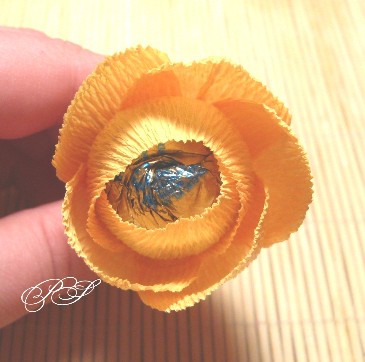 Первый ряд - 1 лепесток. Его высота 1,5 деления гофры. Ширина - примерно 3-3,5 см. (Зависит от величины конфетки, это определяла опытным путем)