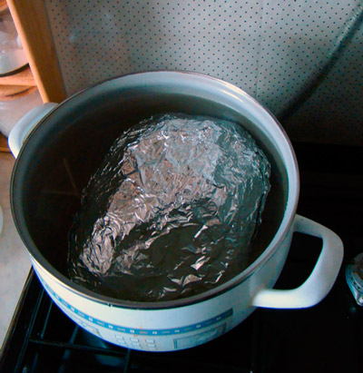 Положить завернутое в фольгу мясо в большую кастрюлю, доверху залить холодной водой, накрыть крышкой и поставить на огонь: