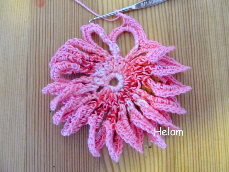 Каждый лепесток обвязать по 1 ст. б/н в 9 ст. предыдущего ряда, (1 ст. б/н ,2 возд.п.,1 ст. б/н) под 2 возд.п. предыдущего ряда, по 1 ст. б/н в 9 ст. предыдущего ряда - повторить 20 раз.