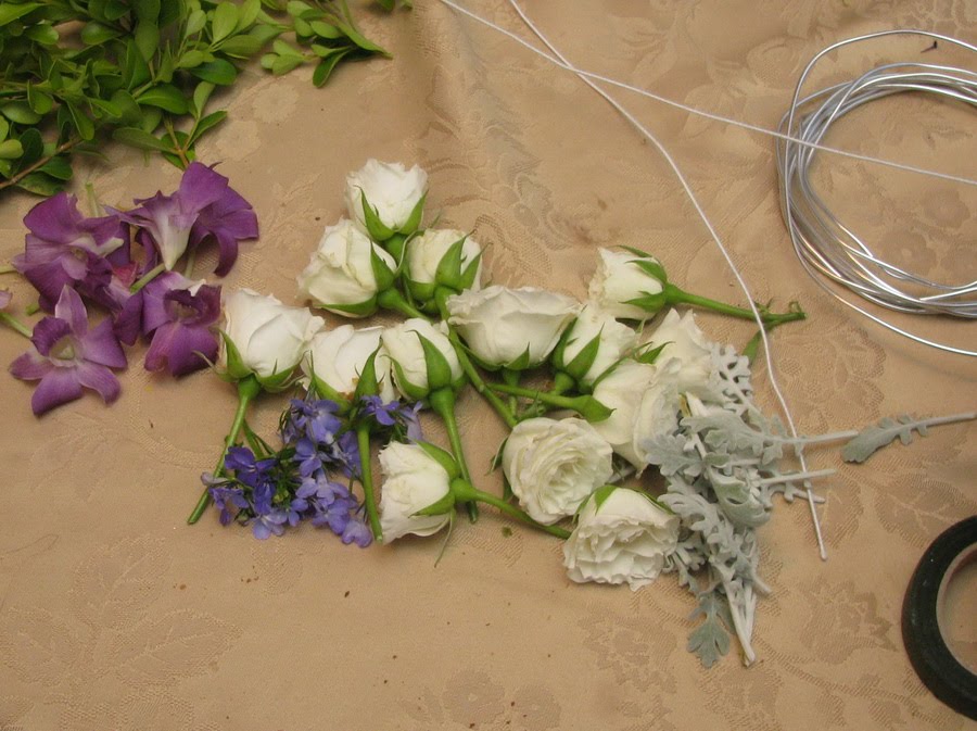 Цветы для венка выбираются стойкие к погодным условиям, обязательно отпаиваются заранее. Не желательно использовать крупные цветы в тонком изящном венке, выбор материала должен соотносится с толщиной венка. Итак, начнем...