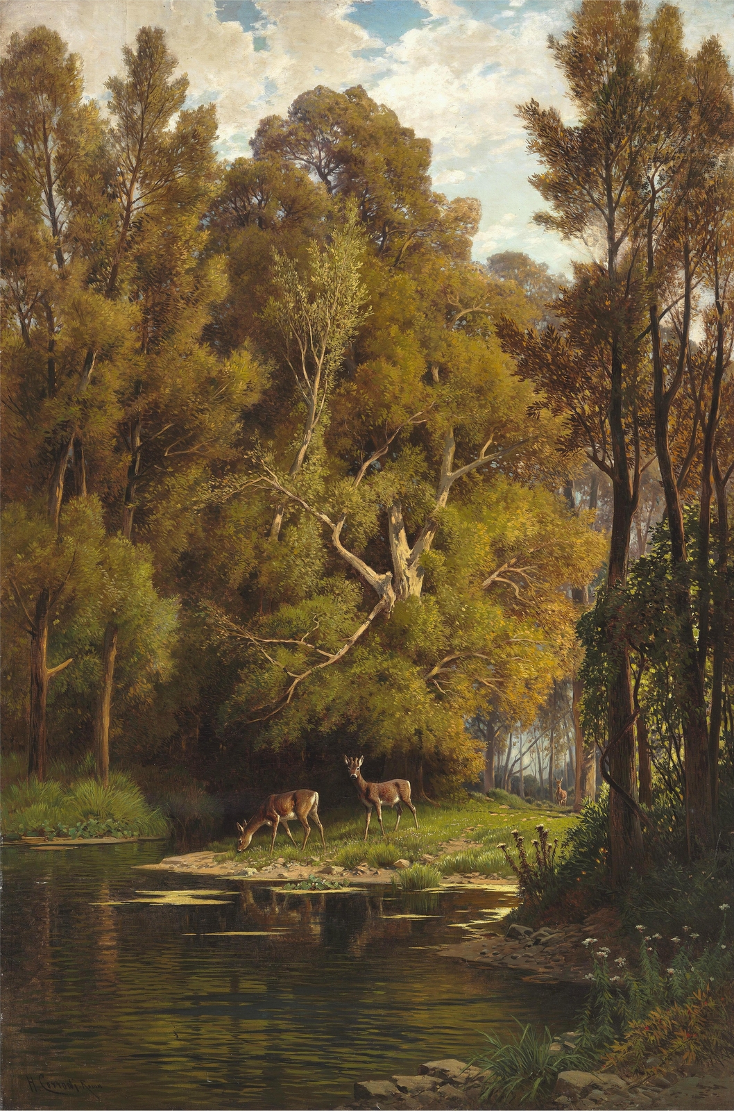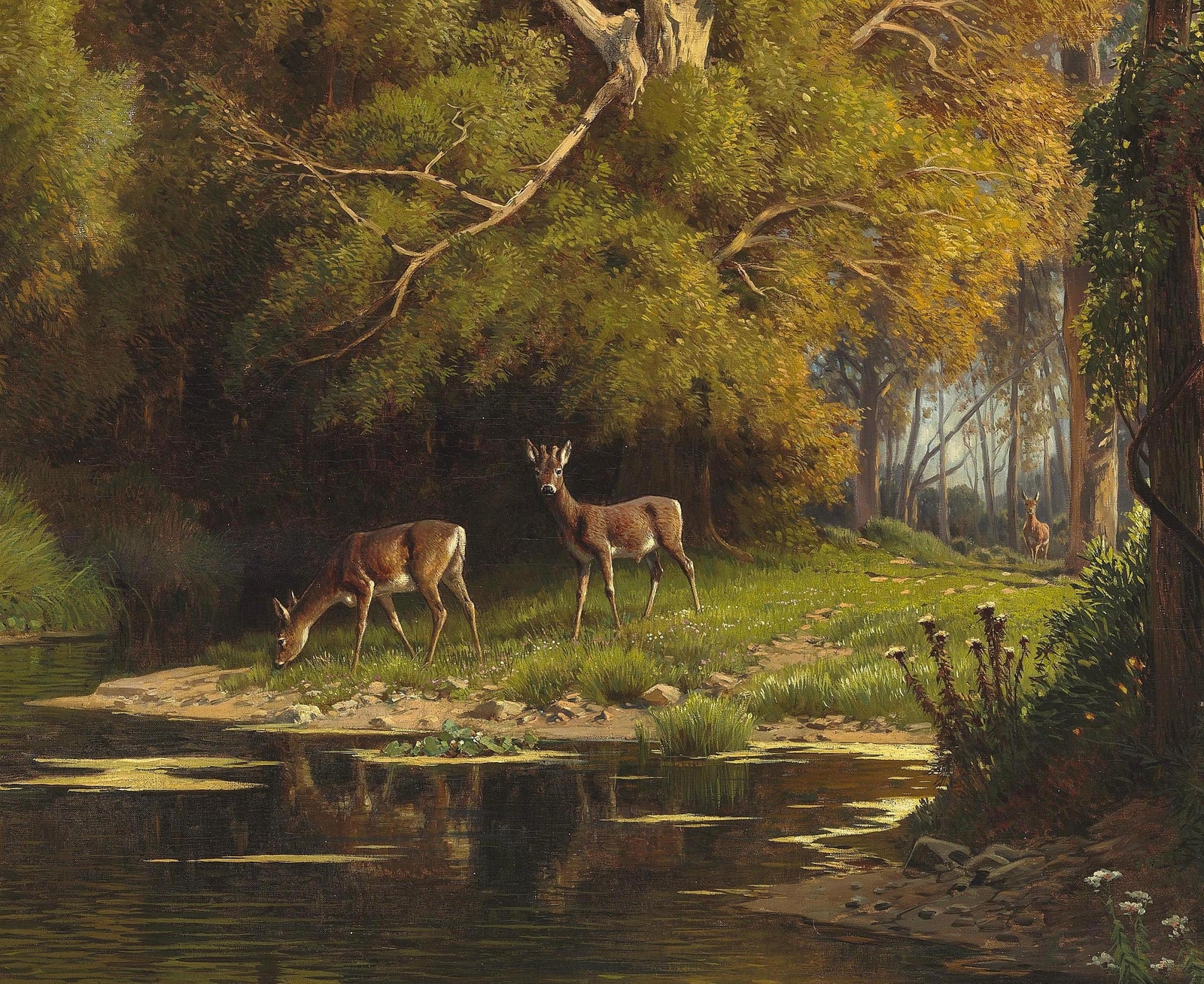 Олени у лесного озера (Deers at a lake in the forest) Частное собрание деталь