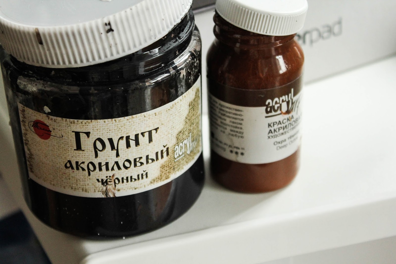 Когда все капельки сформированы - покрываем обложку черным грунтом и сразу мазки коричневого акрила,