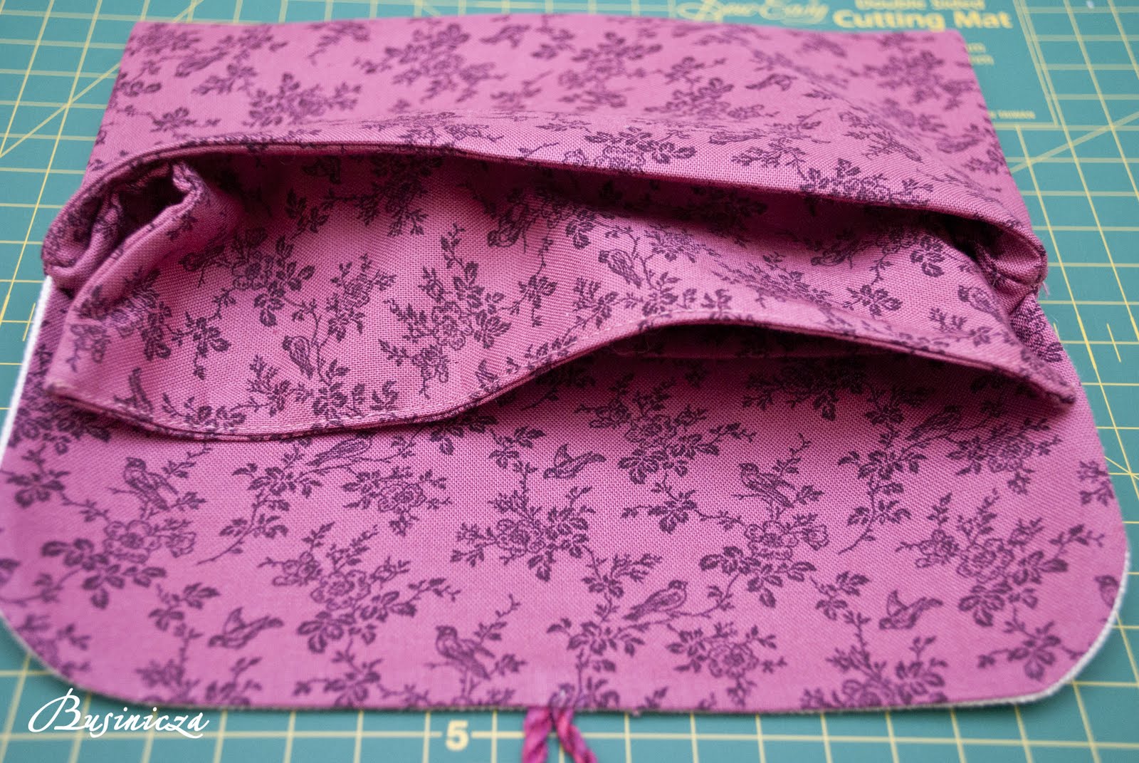 Вывернуть на лицевую сторону, проутюжить. Открытые срезы внутренней части конверта подогнуть на 3-5 мм внутрь, проутюжить.