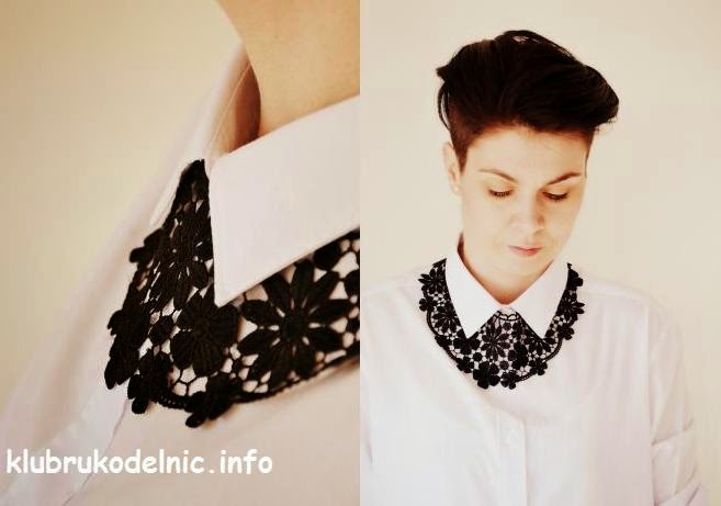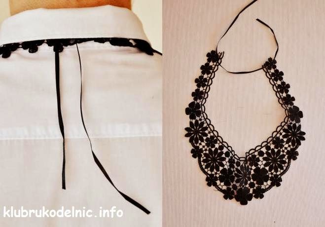 Сразу возникла идея, которую я и воплотила в жизнь, тем более, что это было совершенно просто и быстро: ничего не нужно было резать и шить, всего лишь вырезать из кофточки кружево. Осталось привязать к нему узкую черную ленточку и украсить этим "колье" белую рубашку."