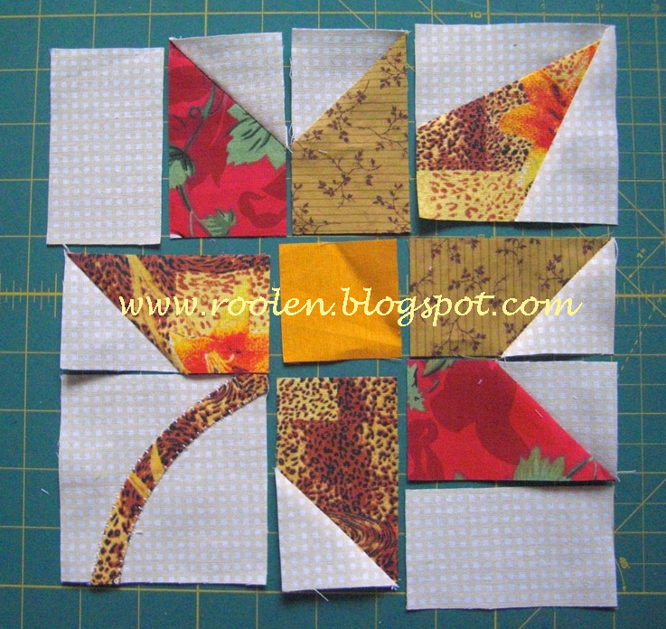 Напомню - для одного листа потребуется два треугольника из фоновой ткани в зеркальном отображении и один ромб из цветной ткани.